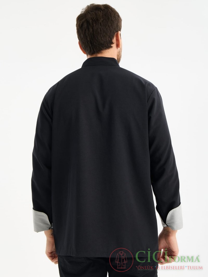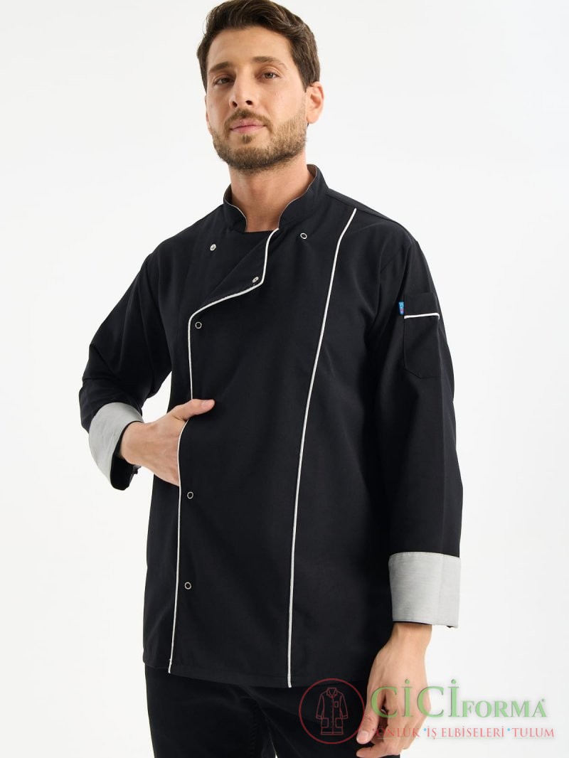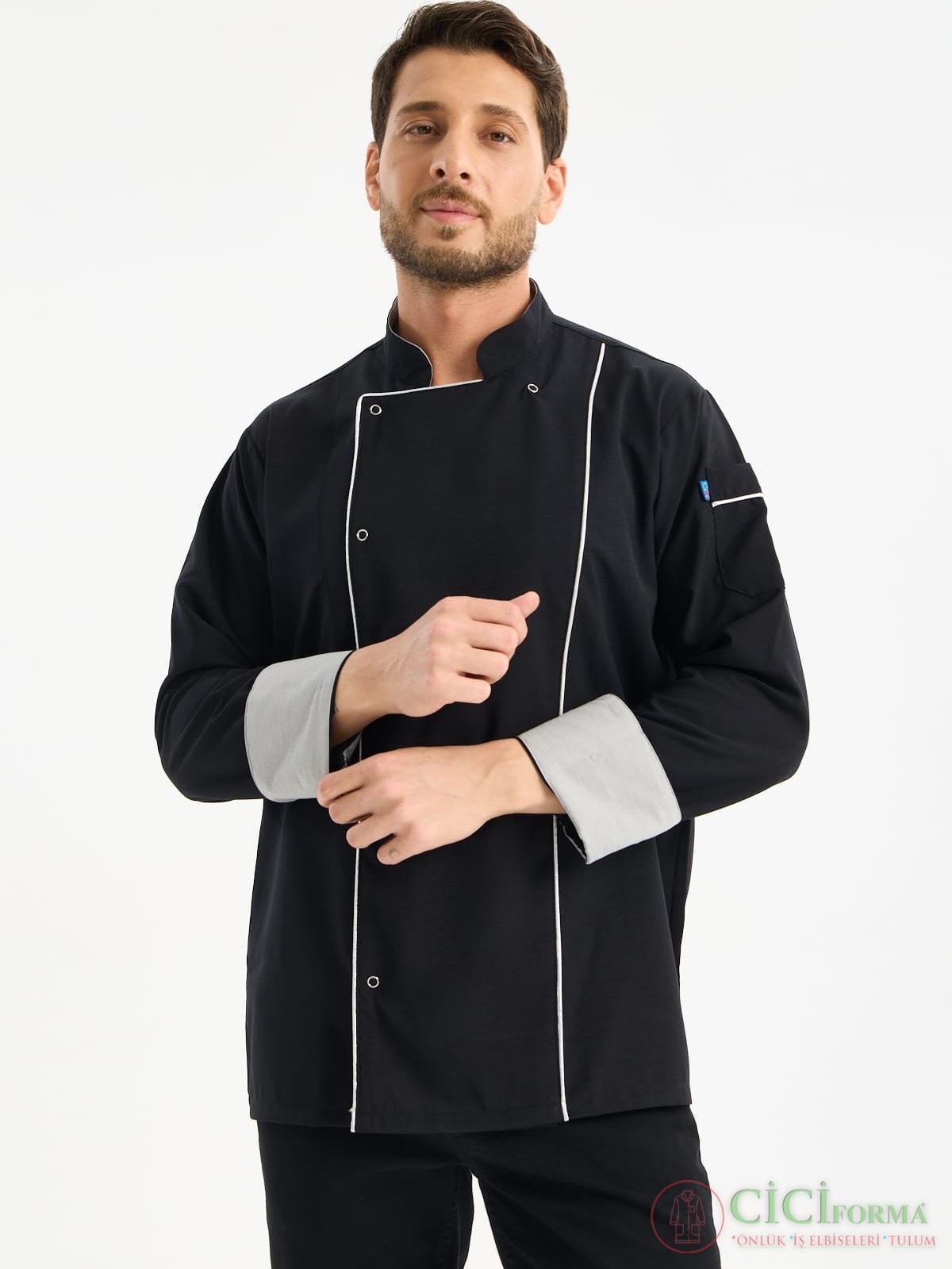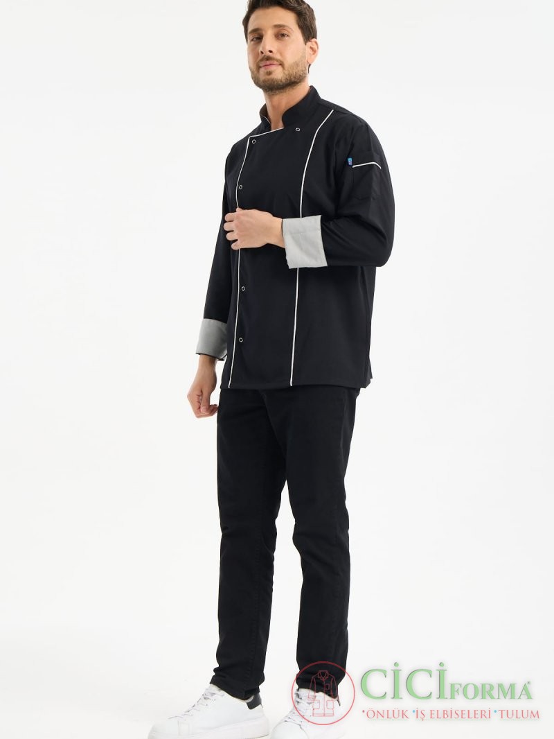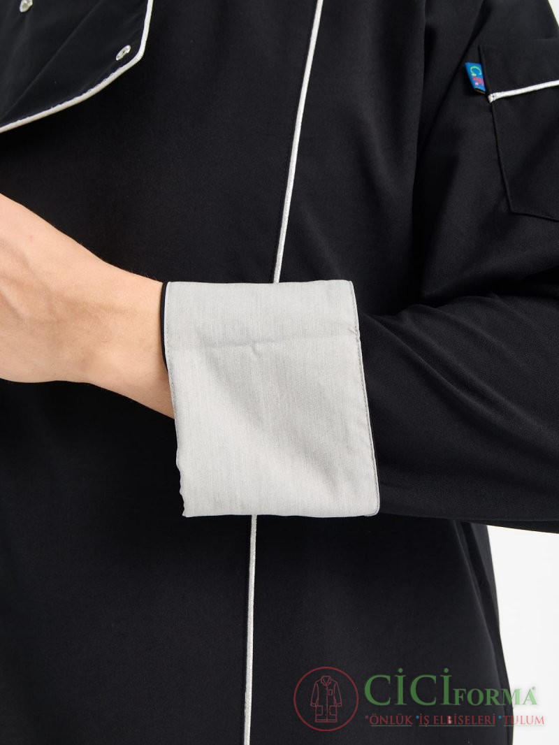 Siyah zemin gri biyeli aşçı üstü Şirketinizin logosunu baskılı veya nakışlı olarak isterseniz bize ulaşabilirsiniz