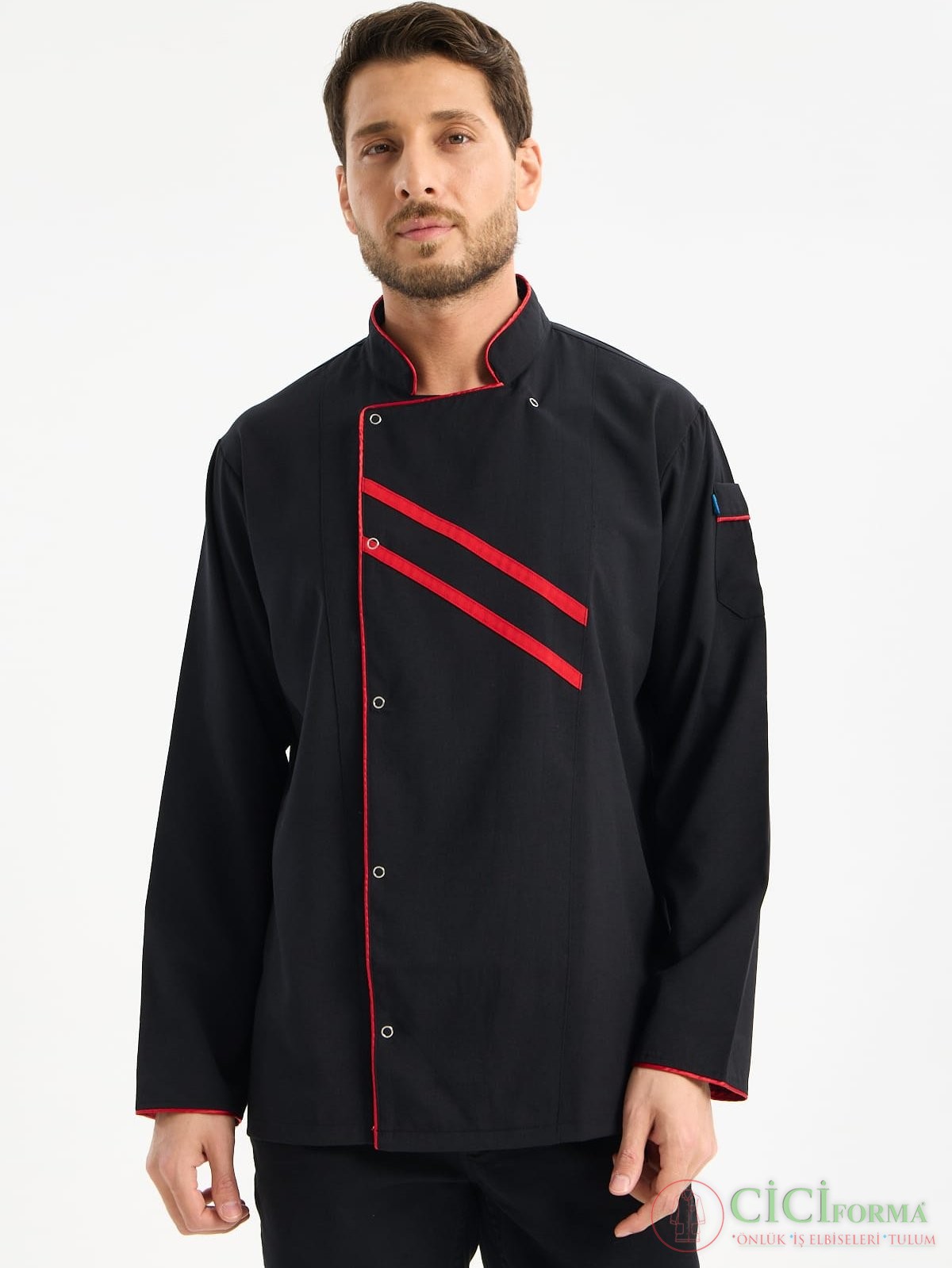 Beyaz Renk Kırmızı Çizgili Cepli Aşçı Forması Üst